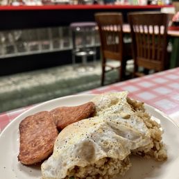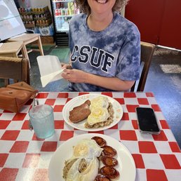 I ordered the 2-2-2 (2 each bacon, sausage, Portuguese sausage). I got fried rice instead of white and chopped everything but the link sausages to make myself a plate of "deluxe" fried rice. We timed it just right and didn't have to wait for a table. Cute little hole in the wall joint and prices pretty reasonable. Street parking pretty non existent (because of nearby church?) so we put the car in a lot.